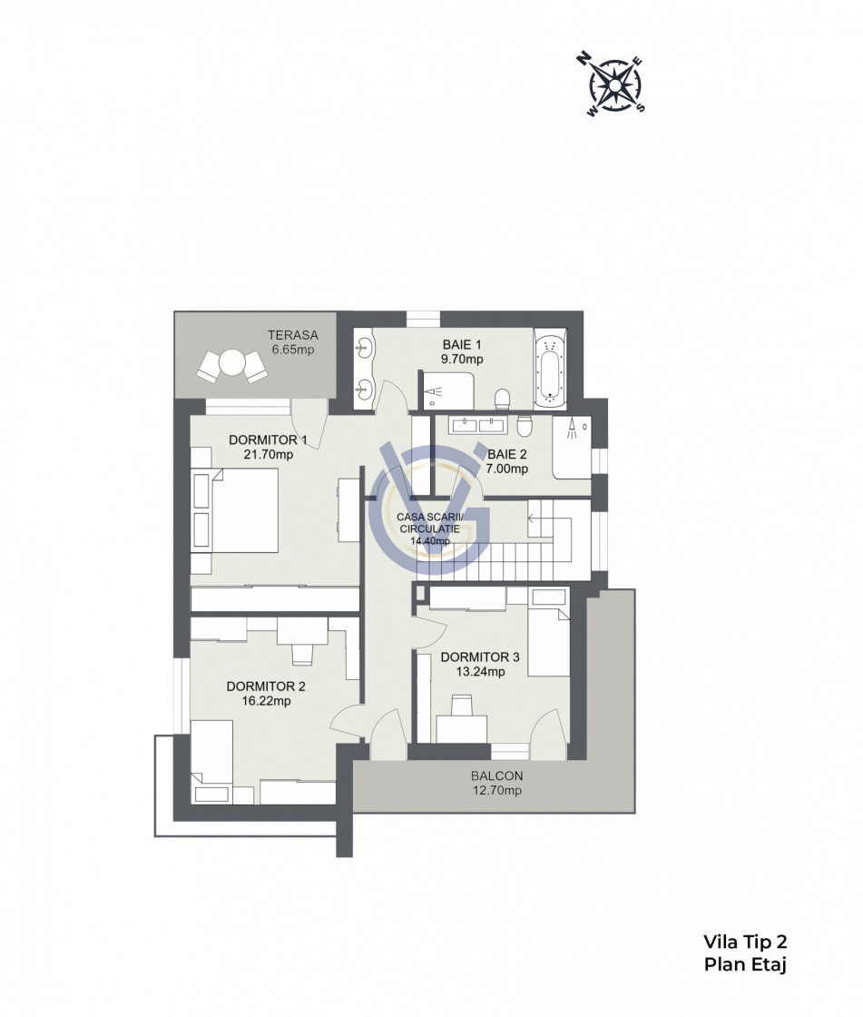 Etajul vilei, cu suprafață utilă totală de 95 mp (din care 76mp utili locuibili și 19mp terase), este dedicat zonei de noapte și cuprinde: